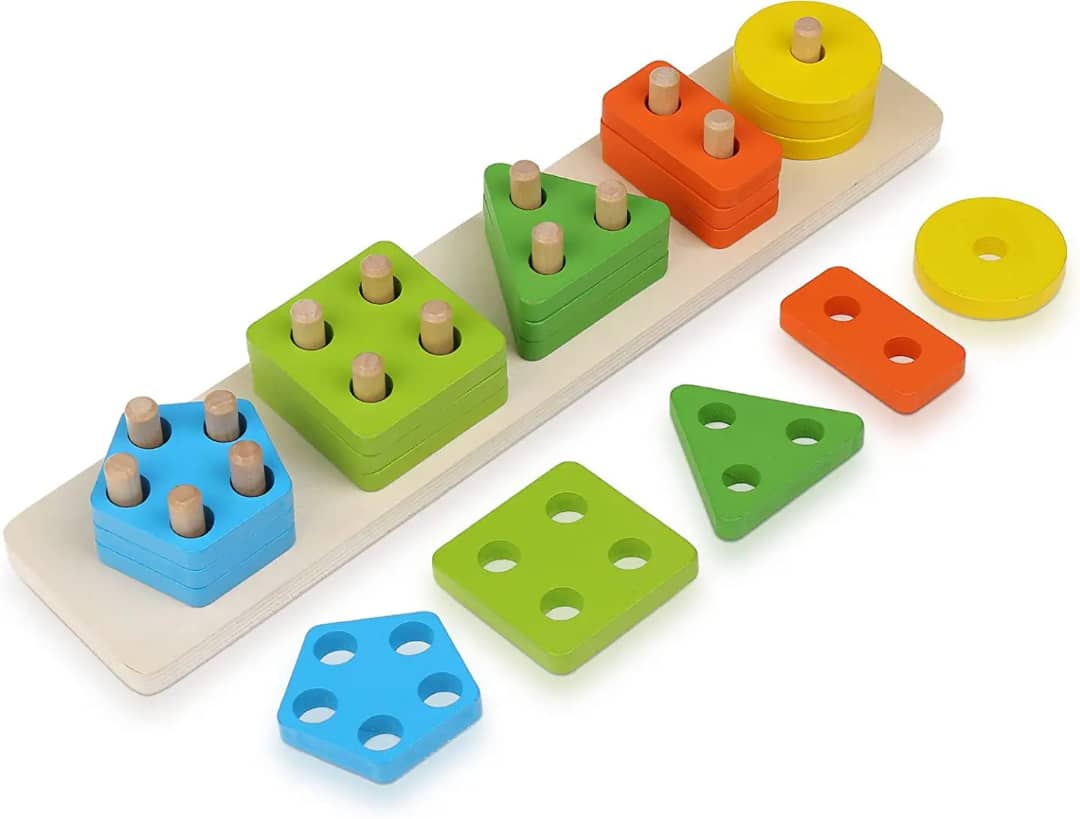 This is a multicolour shape pairing block set with 5 different geometric shapes (circle, rectangle, square, pentagon and triangle). It teaches your child to identify shapes and colours.